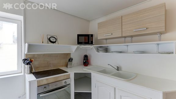 - Une cuisine équipée avec notamment : bouilloire électrique, four, four à micro-ondes, grille-pain, plaques de cuisson, lave-vaisselle, cafetière, etc.