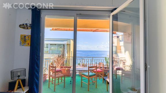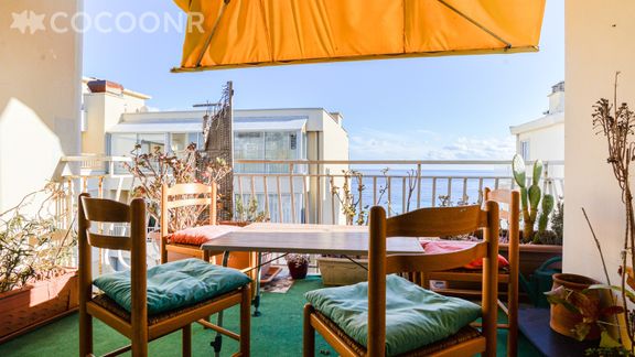 - Un premier balcon de 10 m², exposé sud-est et accessible depuis la pièce de vie. Elle est aménagée avec une table et deux chaises et vous offre une vue imprenable sur la mer !