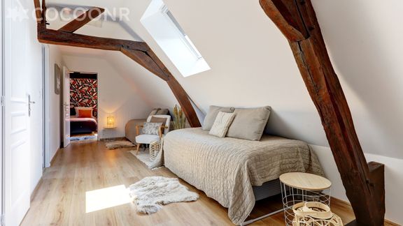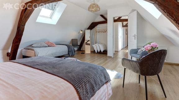 - Chambre 4 : avec un lit queen-size (160×200) + 1 lit simple, ainsi qu'une pièce attenante avec 2 lits simples