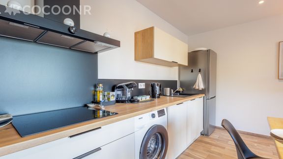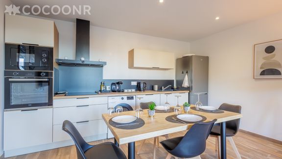 - Une cuisine équipée avec notamment : bouilloire électrique, four, four à micro-ondes, grille-pain, lave-vaisselle, plaques de cuisson...