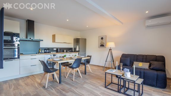 - Une pièce de vie de 25 m² avec TV, canapé-lit double et un espace repas