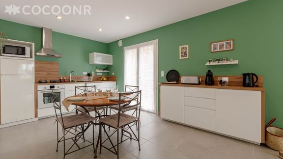 - Une cuisine équipée avec notamment : bouilloire électrique, cafetière Dolce Gusto, four, four à micro-ondes, grille-pain, lave-vaisselle, plaques de cuisson...