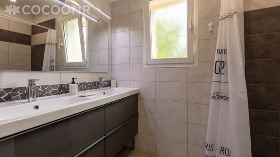 - Une salle d'eau avec douche à l'italienne et lavabo à double vasques