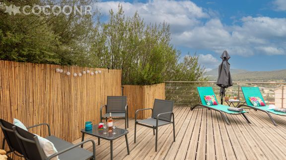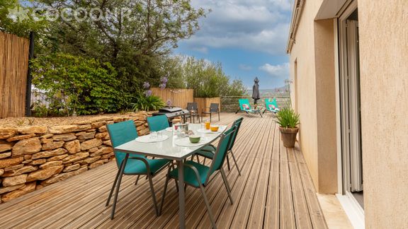 - Terrasse en bois de 80 m² exposition sud-est , avec une table et ses chaises, un salon d’extérieur et de deux transats avec parasol, une plancha à gaz complète l’ensemble.