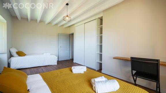 - Chambre 3 : avec un lit queen-size (160×200) et un lit simple