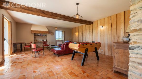 - Une pièce de vie de 75 m² avec canapés, fauteuils, babyfoot, poêle (un sac de granulés offert) ...