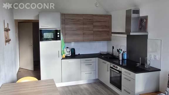 - Kitchenette ouverte sur le séjour : lave-vaisselle, réfrigérateur, plaques de cuisson, micro-ondes, cafetière, grille-pain, vaisselle et couverts...
