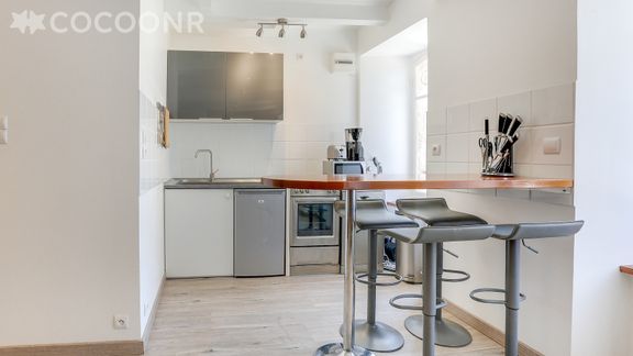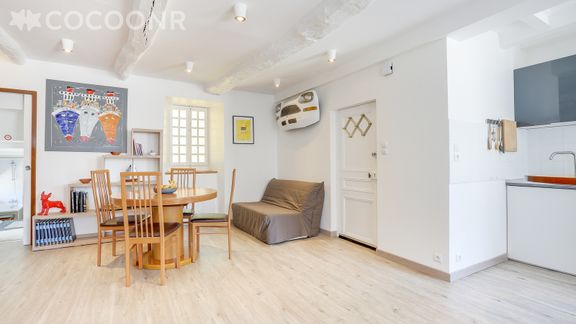 Le logement orienté sud/ouest et situé sur la réputée place du Martray, a été refait à neuf en 2018. Il se compose d'une grande pièce à vivre très claire où se côtoient séjour, espace repas et salon.