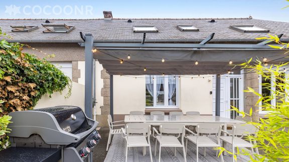 - Une terrasse de 60 m², à l'avant de la maison, équipée de mobilier de jardin, d’une pergola et d’un barbecue