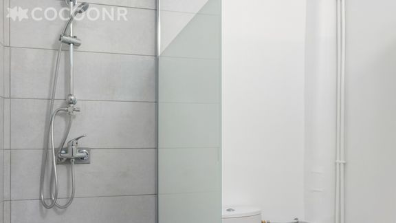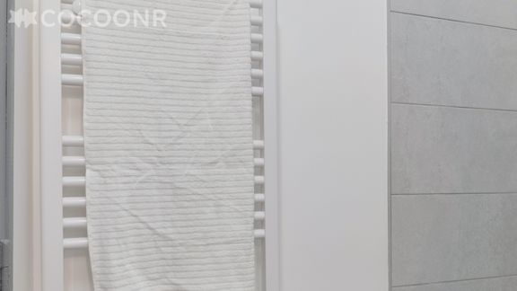 - Salle de bain moderne avec douche à l'italienne, rangements, sèche-serviettes et WC.
