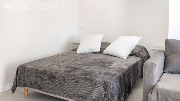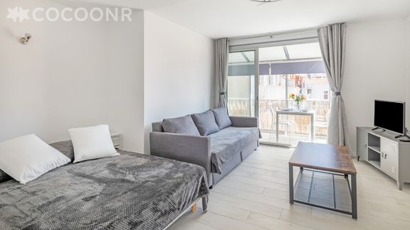 - Pièce à vivre de 25 m² lumineuse grâce à sa grande ouverture donnant sur la loggia, aménagée avec un canapé-lit double, table basse, meuble et TV écran plat. La pièce comprend également un espace nuit avec un lit double (140 cm x 190 cm)