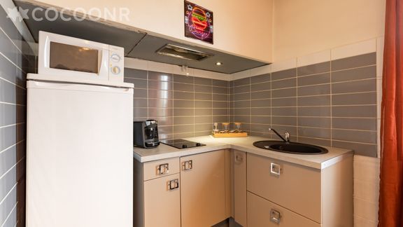 - Une cuisine équipée avec notamment : bouilloire électrique, four à micro-ondes, grille-pain, plaques de cuisson...