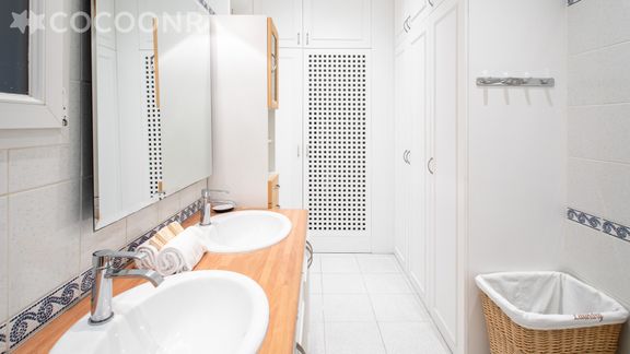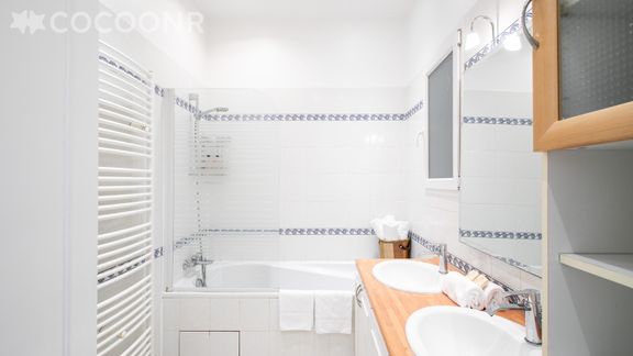 - Une salle de bain avec baignoire et double lavabo.