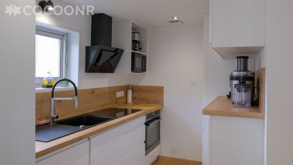 - Une cuisine équipée avec notamment : bouilloire électrique, four, four à micro-ondes, grille-pain, lave-vaisselle, plaques de cuisson...