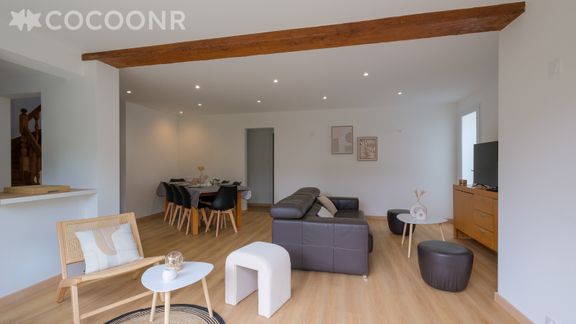 - Une pièce de vie de 30 m² avec TV, canapé, poufs...
