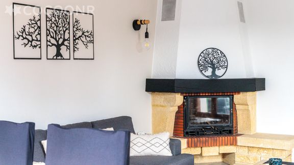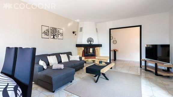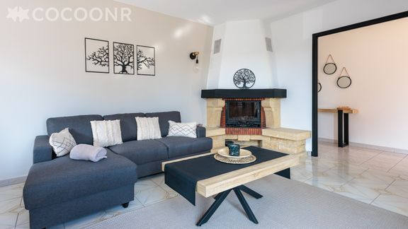 - Une pièce de vie de 25 m² avec TV, canapé, cheminée décorative et un coin repas