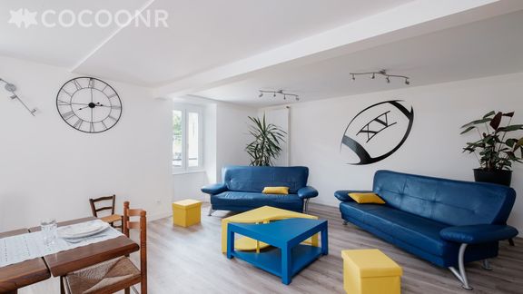 - Une pièce de vie de 45 m² avec TV, canapés et espace salle à manger