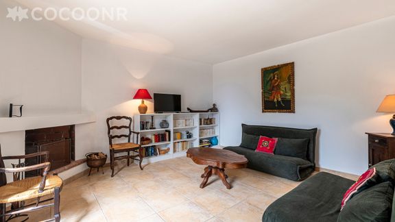- Une pièce de vie de 40 m² avec deux canapés, une banquette, une cheminée, coin repas, TV...