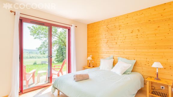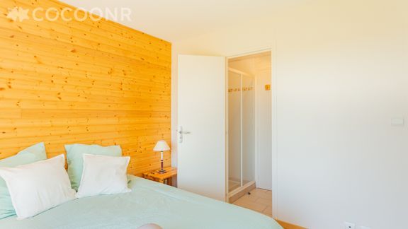 - Chambre 1 dotée d'une grande baie vitrée aménagée avec lit queen-size (160 cm x 200 cm), salle d'eau attenante avec douche et WC.