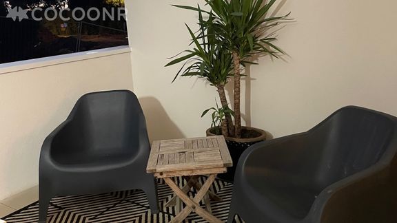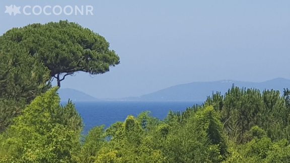 - Une terrasse de 20 m² sans vis à vis avec une grande table en bois pour y déjeuner, pour télétravailler ou pour toutes autres activités ; d'un côté, salon de jardin avec tapis, 2 grands fauteuils club et table basse... Et de l'autre côté, 2 bains de soleil pour bronzette et relaxation. Une table avec plancha est à disposition. Terrasse avec vue sur la garrigue et vue partielle sur mer.