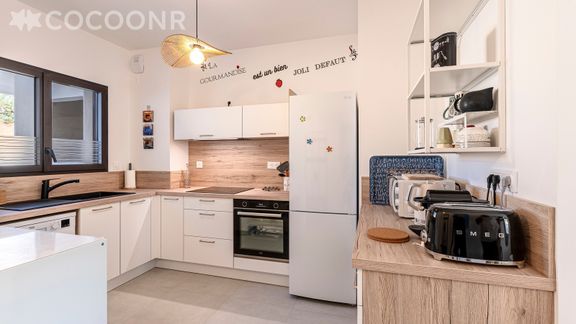 - Une cuisine équipée avec notamment : plaques à induction 3 feux, lave-vaisselle, four, grand frigo/ congélateur, bouilloire électrique, micro-ondes, grille-pain, cafetière expresso et verseuse Melitta, appareil à raclette/fondue, mixer….