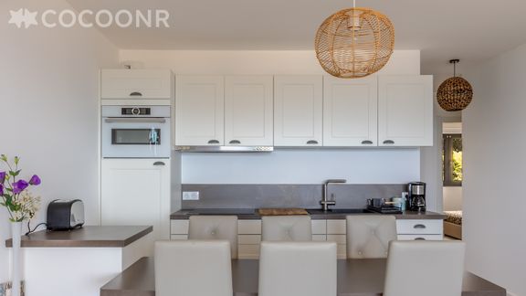 - Une cuisine équipée avec notamment : bouilloire électrique, four, four à micro-ondes, grille-pain, lave-vaisselle, plaques de cuisson...