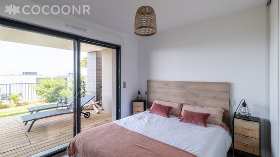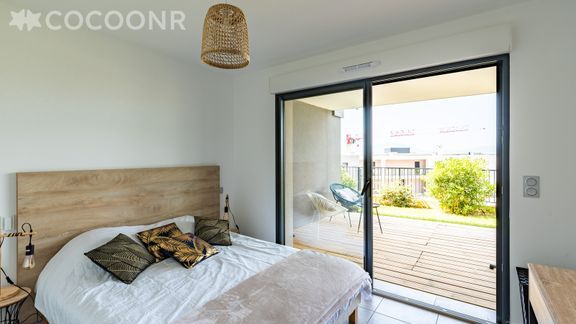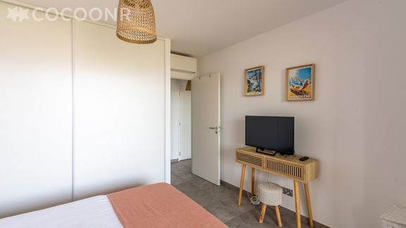 - Chambre 2 : un lit queen-size (160×200) avec accès à la terrasse et au jardin.