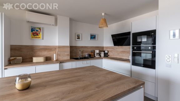 - Une cuisine ouverte équipée avec notamment : bouilloire électrique, four, four à micro-ondes, grille-pain, lave-vaisselle, plaques de cuisson, cafetière à dosettes Nespresso...