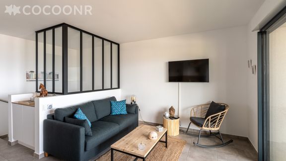 - Une pièce de vie de 37 m² avec TV, canapé convertible (double), fauteuil et espace repas.
