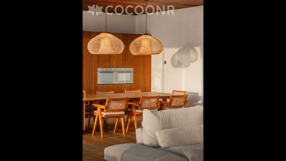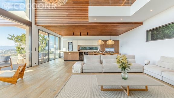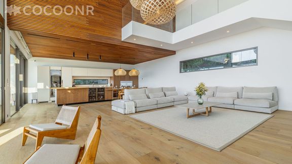 - Une pièce de vie de 110 m² d'une hauteur sous plafond de 6,5 m avec 12 m de baies vitrées offrant une vue sur la mer. Elle est composée d'une TV, de canapés, de fauteuils et d'un espace repas