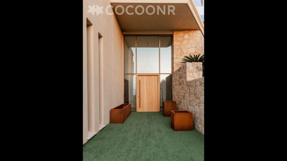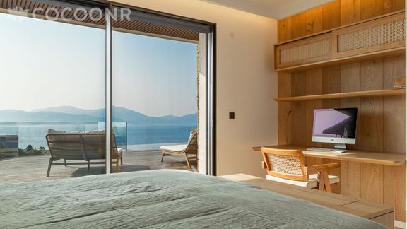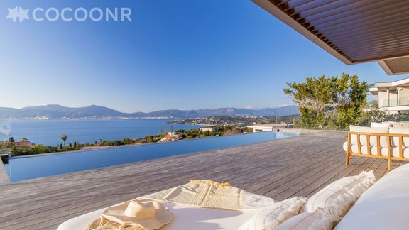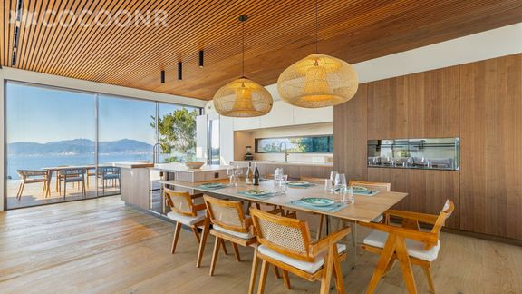 - Une grande terrasse principale de 180 m² face à la mer, donnant sur la piscine à débordement et les espaces de vie ainsi que la chambre au rez-de-chaussée, entièrement aménagée pour les repas et la détente.