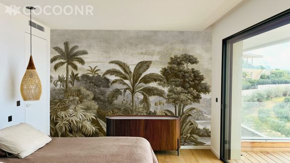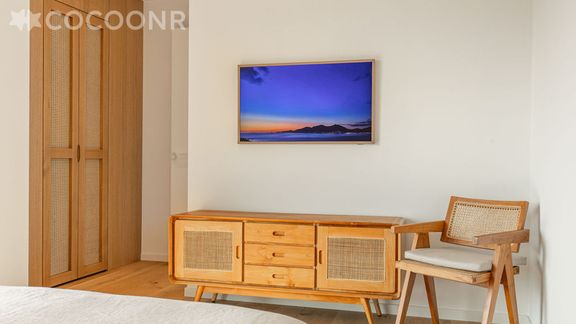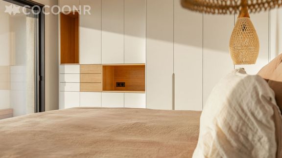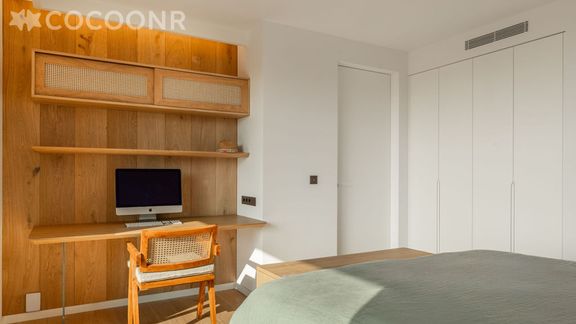 - Le bois est omniprésent, notamment dans la cuisine, à travers les parquets (hors salles de bains), les habillages muraux, les dressings sur mesure, les portes persiennes ou en cannage, ainsi que le mobilier intégré en chêne massif.