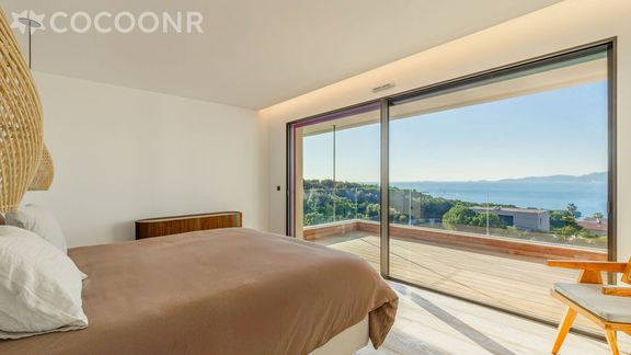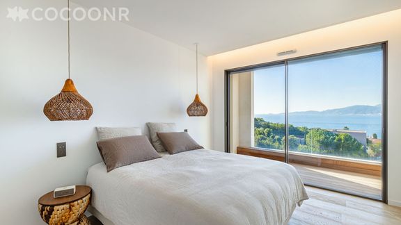L’agence Cocoonr vous propose à la location, à Pietrosella, cette villa d’exception nichée au sommet d’une colline, au cœur d’un domaine privé et sécurisé composé de seulement 15 villas haut de gamme. D’une superficie de 300 m², entièrement climatisée, elle peut accueillir jusqu’à 8 voyageurs et se situe à quelques pas de la plage. Lumineuse, chaleureuse et tournée vers la vue, la villa mêle esprit bord de mer et nature corse pour offrir un cadre à la fois élégant et cocooning.