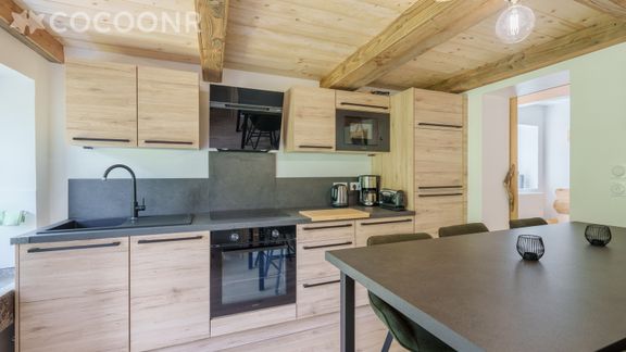 - Une cuisine équipée avec notamment : bouilloire électrique, four, four à micro-ondes, grille-pain, lave-vaisselle, plaques de cuisson...