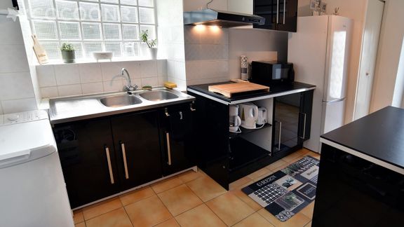 - Une cuisine équipée avec notamment : bouilloire électrique, four à micro-ondes, grille-pain, plaques de cuisson...