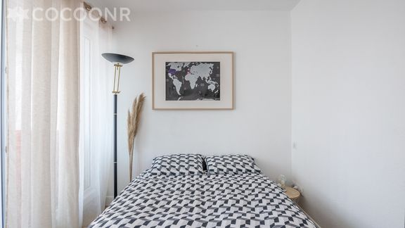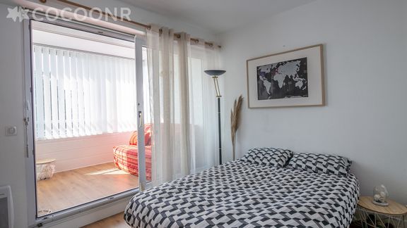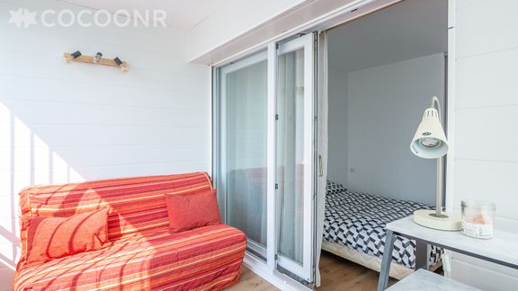 - Chambre aménagée avec un lit double (140 cm x 190 cm), une penderie et un placard. En enfilade de la chambre, vous découvrirez une loggia avec un canapé-lit double.