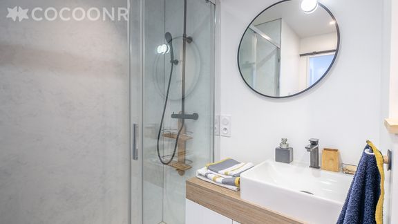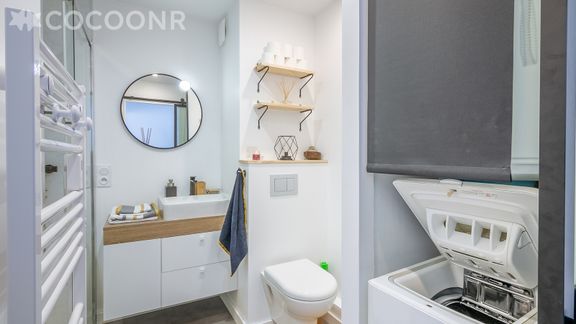- Salle d'eau moderne avec douche, WC, sèche-serviettes et machine à laver