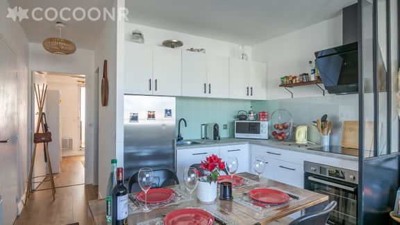 - Belle cuisine entièrement équipée avec table à manger haute, 4 chaises, lave-vaisselle, réfrigérateur, four, cafetière Nespresso, plaques de cuisson, bouilloire, grille-pain, vaisselle et couverts...