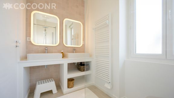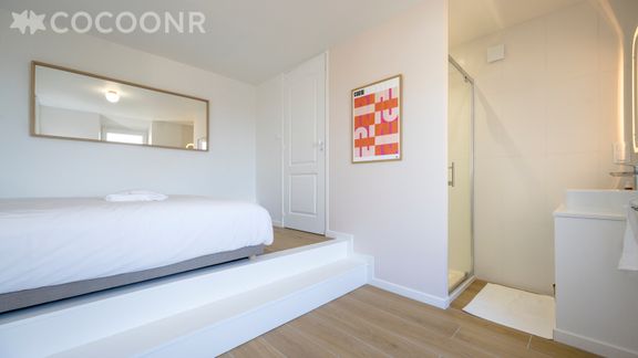 - Une chambre avec un lit queen-size (160×200), une salle d'eau attenante avec douche et meuble vasque