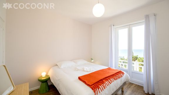 - Chambre 1 : un lit king-size (180×200), balcon avec vue mer