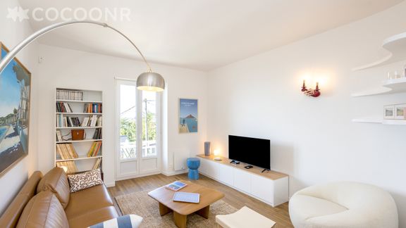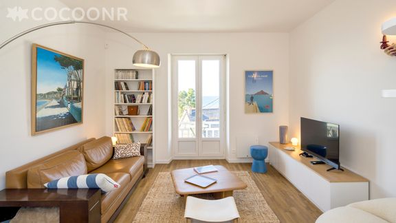 - Une pièce de vie de 20 m² avec canapé, TV, balcon avec vue mer
