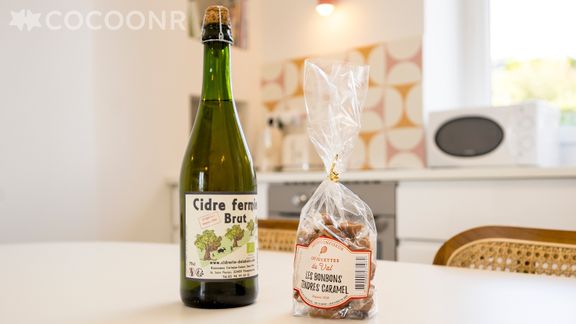 Merci pour la délicate attention : la bouteille de cidre et les caramels au beurre salé.🍾🙏