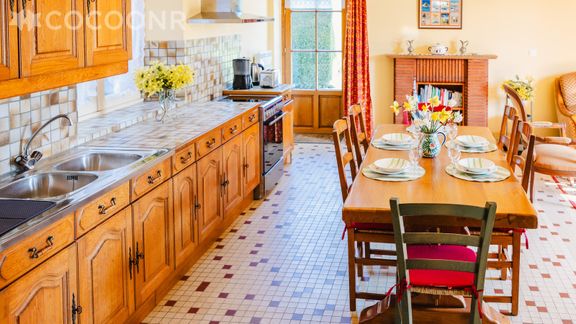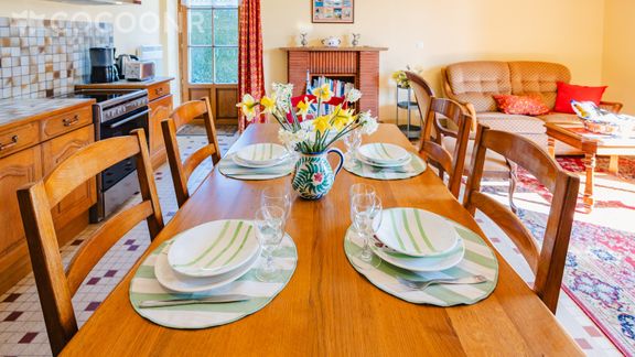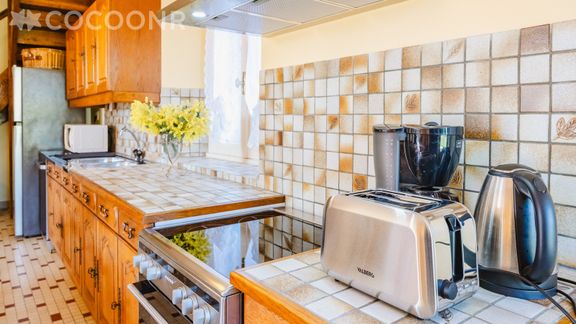 - Une cuisine équipée ouverte avec notamment : bouilloire électrique, four, four à micro-ondes, grille-pain, lave-vaisselle, plaques de cuisson... avec son espace repas