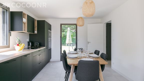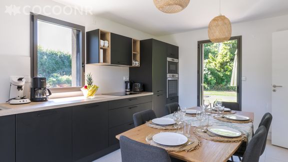 - Une cuisine séparée, entièrement équipée : réfrigérateur, lave-vaisselle, congélateur, four, plaques à induction, micro-ondes, grille-pain, bouilloire, cafetière..