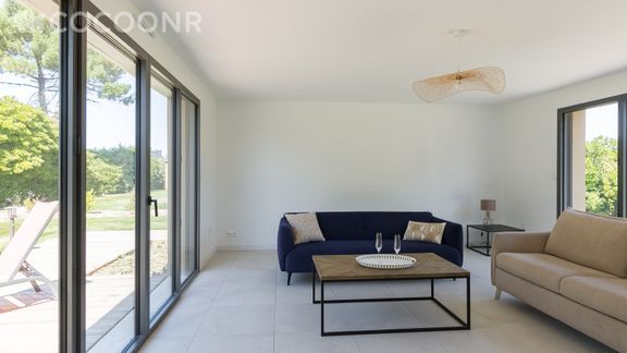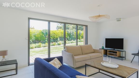 - Une belle pièce de vie lumineuse avec un coin salon doté d'un canapé-lit double et de fauteuils, une table basse, une TV (équipement Netflix) ainsi qu'un espace repas avec une table à manger pouvant accueillir jusqu'à 6 convives.