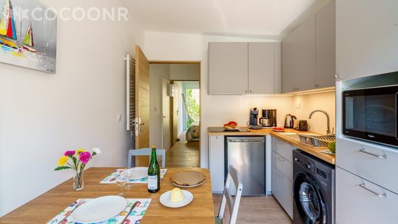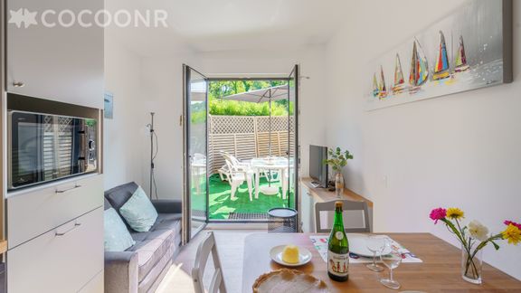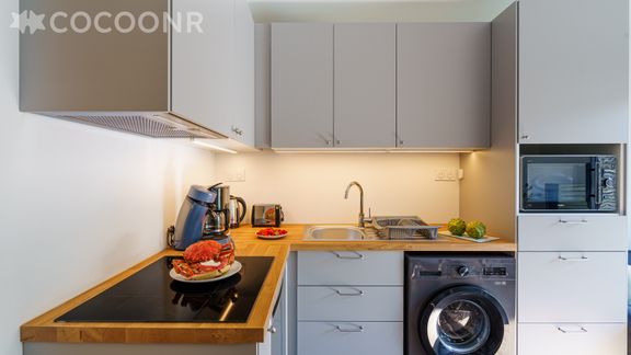 - Une pièce de vie avec un canapé, une TV et une cuisine ouverte équipée de 11 m² avec notamment : bouilloire électrique, four, four à micro-ondes, grille-pain, plaques de cuisson, mixeur, appareil à raclette, lave-linge, sel, poivre, huile, vinaigre...