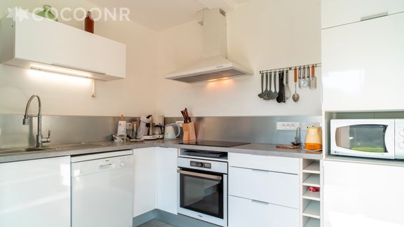 - Une cuisine équipée avec notamment : bouilloire électrique, four, four à micro-ondes, grille-pain, lave-vaisselle, plaques de cuisson...