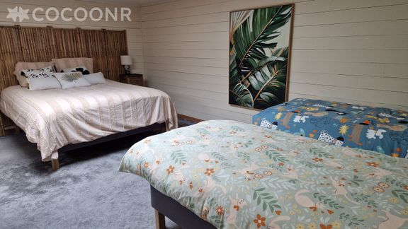 - Espace avec un lit queen-size (160×200), 2 lits simples et un filet suspendu
