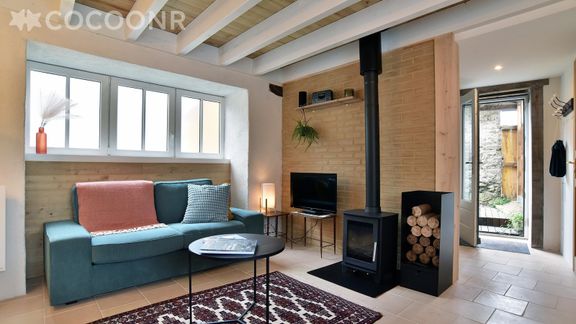 - Une pièce de vie de 25 m² avec canapé, TV, coin repas et poêle