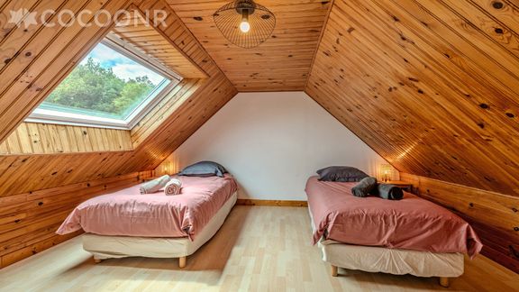 - Chambre 3 (mezzanine) : une pièce reprenant toute la surface du logement avec 3 lits simples